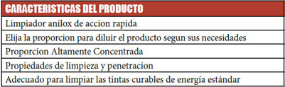 | Descripción: Para la limpieza de alta resistencia de UV / Energía tintas curables, disolventes y agua. Donde otros lavados son lentos o no, este limpiador UV funcionara. Elimina los pigmentos arraigados de las celdas y otras aéreas. Puede ser diluido en agua de 1 a 3 partes hasta 1 a 6 partes. Esto le permite elegir la velocidad de dilución que mejor se adapte a sus necesidades. |